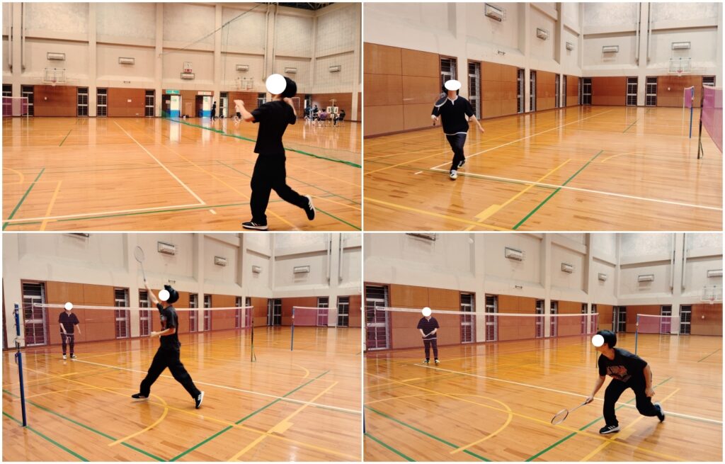 左上の写真はスマッシュのテイクバックの様子です。しっかりと半身になり、右足にしっかりと体重を預けて、右手の肘をしっかりと上げてラケットを振れるともっとよくなりますね。肘が上がっていないとスマッシュの打点が左下の写真のような位置になります。コートの奥からこの打点でスマッシュを打っても角度がつかずに相手にカウンターの隙を与えます。まあ、左下の写真はスマッシュではないからいいですけどね。右下の写真はコート左前に落ちてくるシャトルに向かって移動しているところです。いつでもシャトルを触れる状態で移動できているところが進歩しています。しかし、ここからもう一歩が出ない足運びになっているところが少し残念。まあ、足運びが悪くてももう少し上体が上がっていればサイドステップの要領でシャトルに追いつくことは可能です。どちらの方法でシャトルを追えるようにしていくかは自分に合った方を選ぶといいんじゃないかなと思います。