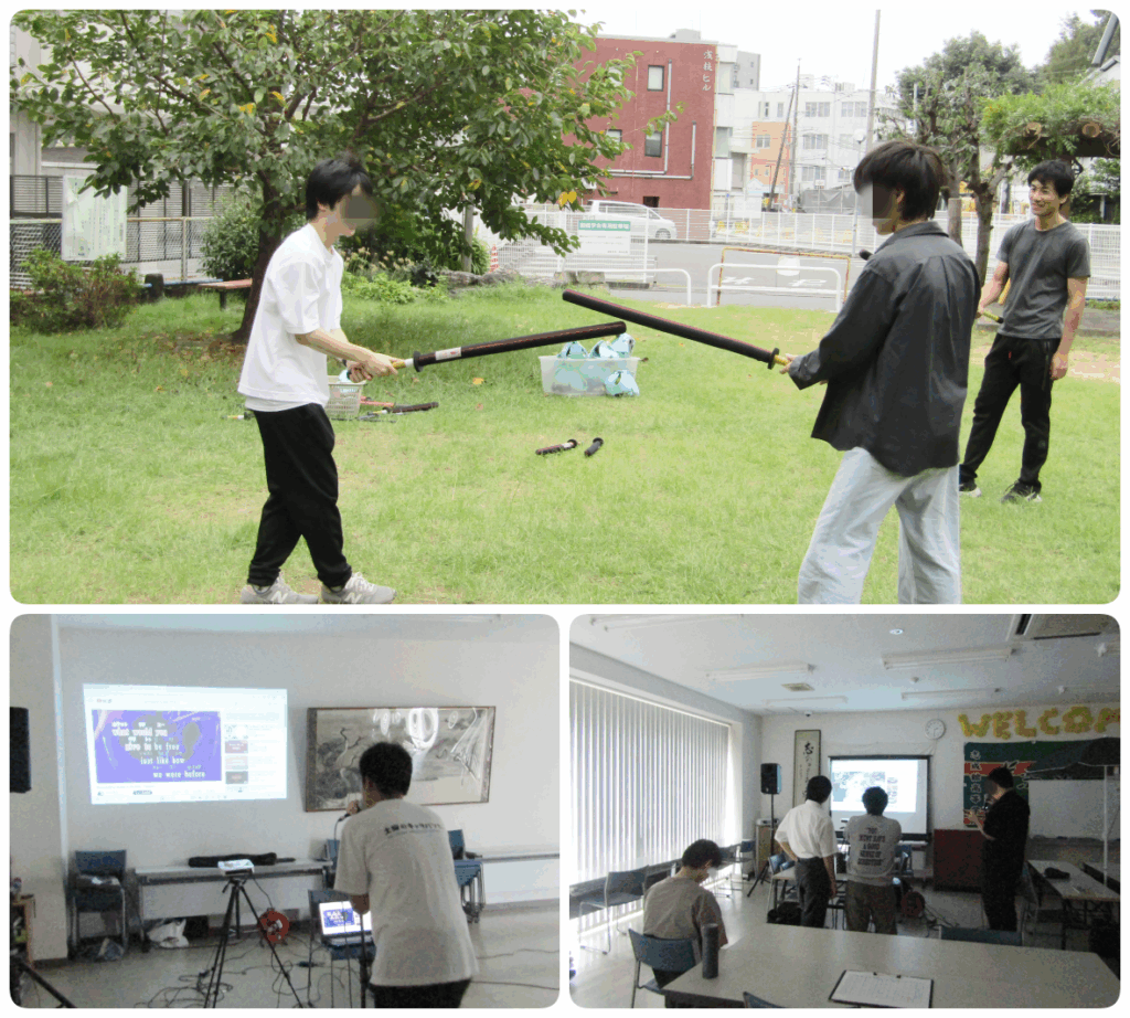 なかなか剣を持つ機会がない生徒はチャンバラ用の剣に興味津々。ヘルメットをかぶっていざ出陣!といった感じでした。