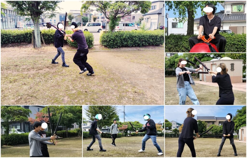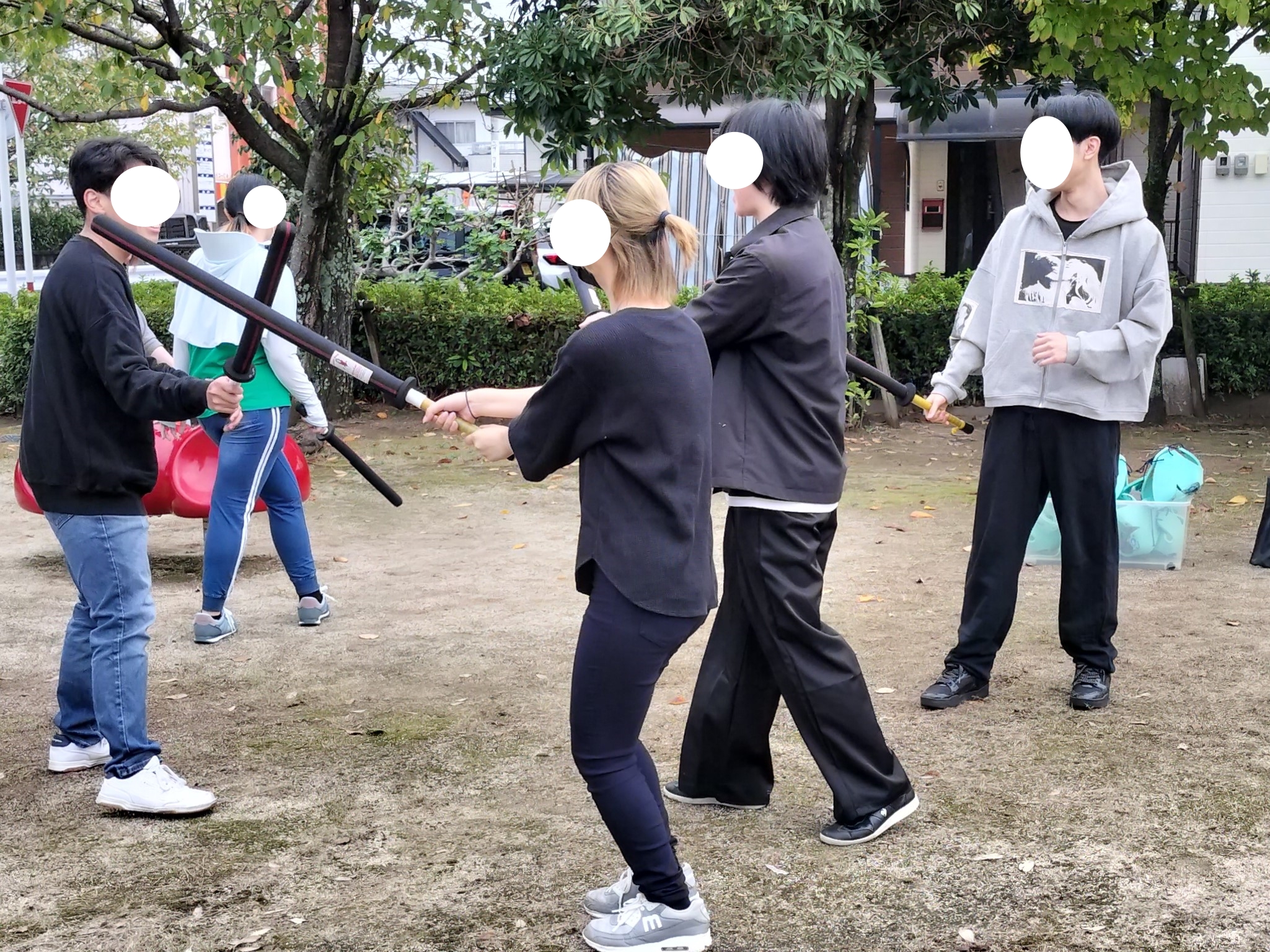 本日の体育はスポーツチャンバラを行いました。体育館内で行う予定でしたが、何と体育館は全てイベントで貸し切り、しかも体育館の横の緑公園はゲートボールで占有使用中。仕方なくSEIMS横の公園でチャンバラをしました。運が悪いなぁと最初は思っていましたが秋の空気はとても気持ちがよかったです。