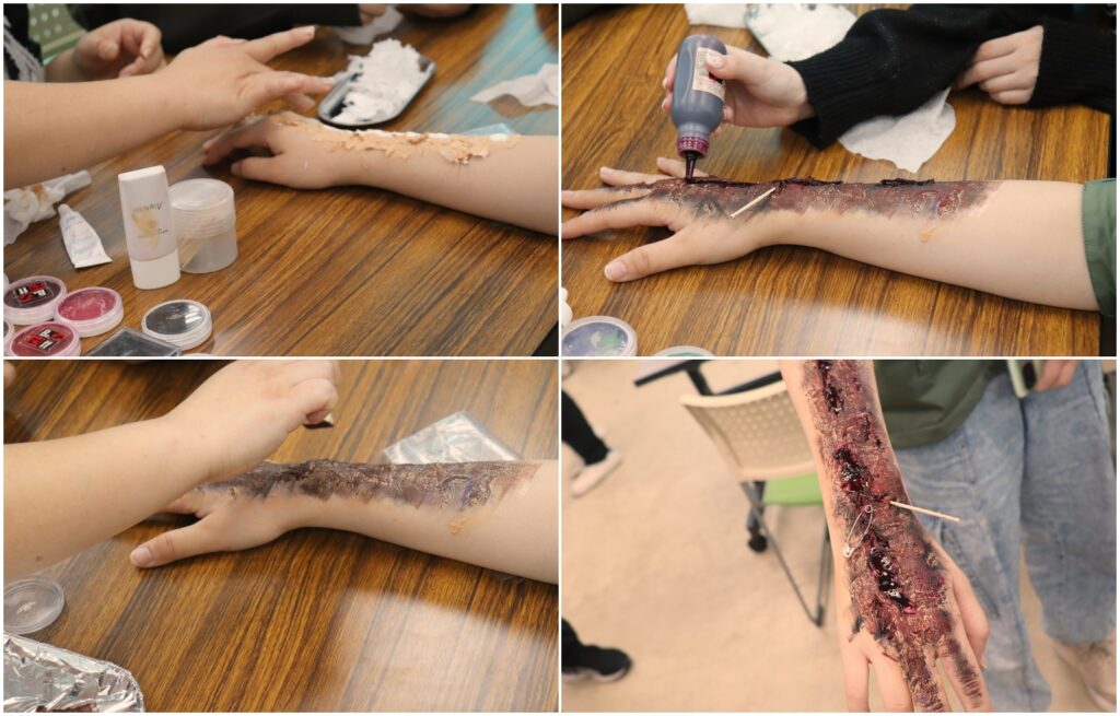 それから、明日のハロウィーンを意識しての傷メイク!ぱっと見、とんでもない重症にしか見えません。ちなみに私の中指はヒロアカのワン・フォー・オール100%のデコピンの反動で傷ついたという設定です。これは、ちぎったティッシュを肌に糊付けし、その上から様々な色のファンデーションを塗り重ねていき、最後に血のりをつけていくとできていきます。血のりを付ける前の真っ黒な肌は本物の焦げた肌のようなんです。明日のBBQ大会が待ち切れずにとりあえず、炙ってみましたみたいな感じで、最初は「えっ!?」と思いましたよ。ハロウィーンでもない日にコスプレもせずに、この傷メイクで外を歩くと救急車を呼ばれてしまいそうなので絶対にやめておきましょう!