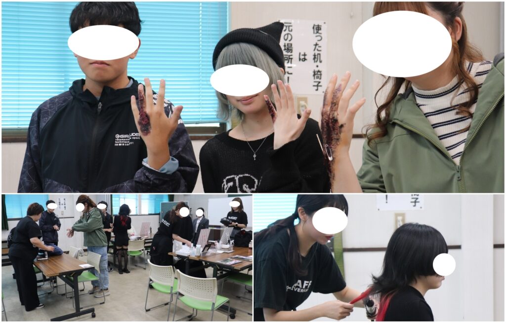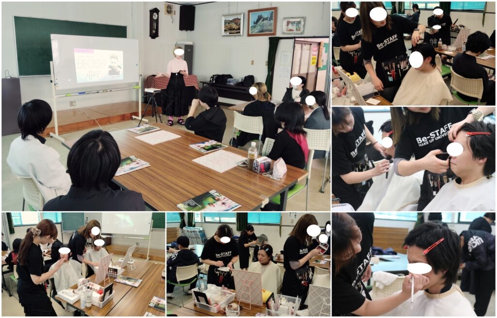 本日の総合探求の時間はメイクの学校である「Be Staff」の先生と生徒の方々をお招きして、特別授業メイク講座を行ってもらいました。まずは、メイクの業界やお仕事のお話をしていただき、Be Staffがどういった学校なのかをお話していただいた後、メイク、ヘアーメイク、傷メイクの体験をさせていただきました。Be Staffさんには志成祭でもステージパフォーマンスやブースで施術をしてくださいました。そのため、普通は恥ずかしがってメイクをしたがらない男子生徒もBe Staffの先生や生徒の方々にはすっかり気を許して、施術をしてもらいました。
