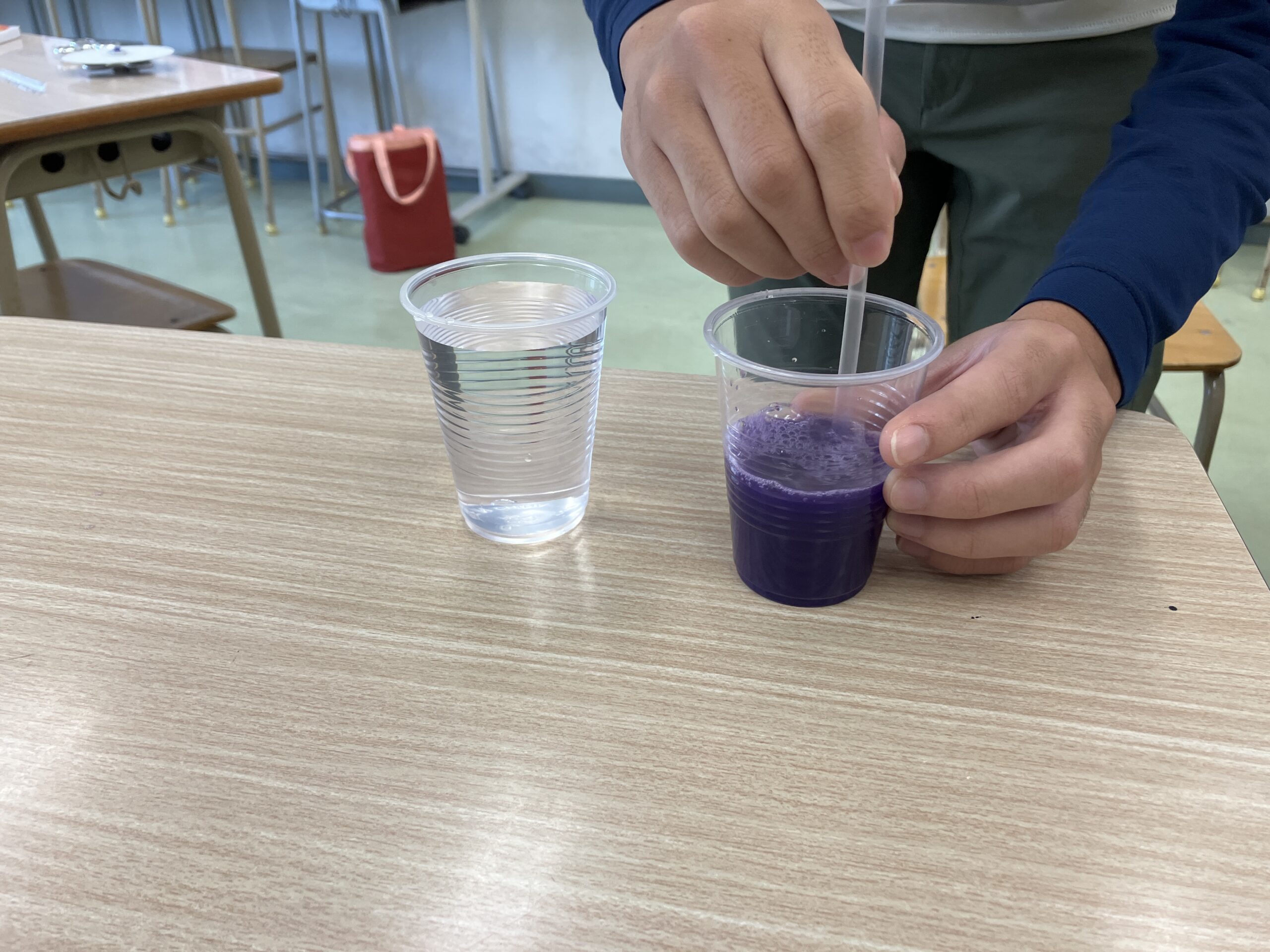 さあ、本日は1年生の化学と人間生活の授業では「拡散」の実験を行いました。ガンダム(特にZやZZ)が大好きな人が拡散と聞くとサイコガンダムの拡散メガ粒子砲を思い浮かべると思いますがその「拡散」です。「拡散」とは粒子、熱量、運動量等が散らばり広がる物理的な現象をいいます。校内でガンダムのメガ粒子砲を放つ校舎ごと、ドロドロに溶解するか消し飛んでしまうので、代わりに着色無職の水の中に落とすことで「拡散」の様子を観察しました。(ちなみに、メガ粒子砲は仕組みは違えど現実にも存在し、というか三菱重工業と防衛庁が共同で開発をしているらしいです。)着色水を垂らし過ぎると一瞬で色水になるので生徒たちは悪戦苦闘しながら一滴、且つ、小さな一滴だけを垂らそうとするもZZガンダムのハイパーメガキャノン並みの一滴をかましてしまい、スペースコロニー(無色の水)を紫色の爆炎(着色した水で)で染め上げちゃうこともありましたが、その様子は私(甲斐)の童心(厨二病精神)をくすぐりました。本当にありがとう、君たち!