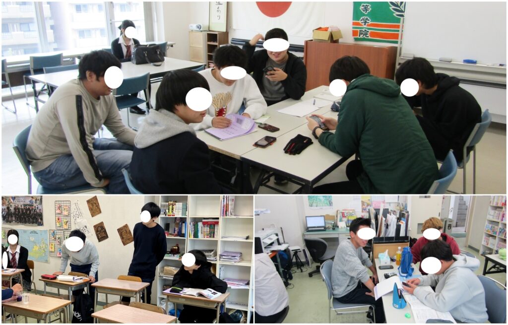 お昼あたりに6Fを除くと午後の数学学び直しに備えて?モンストで息を抜いてるのかヒートアップしてるのかよくわからない男子諸君がいました。昨日のテニス(公園遊び?)で筋肉痛というで痛い足をさすりながらモンストで熱くなる姿は巨大スーパーロボットの中で必殺技の名前を連呼するヒーローたちの姿のようでした。
