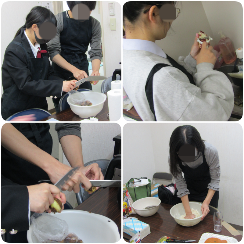 だんごをこねるのにも力がいりましたね。身長が高い生徒は「腰が痛い…。」と悲痛な表情をしていました。多分、調理室のテーブルの高さが原因だと思います。