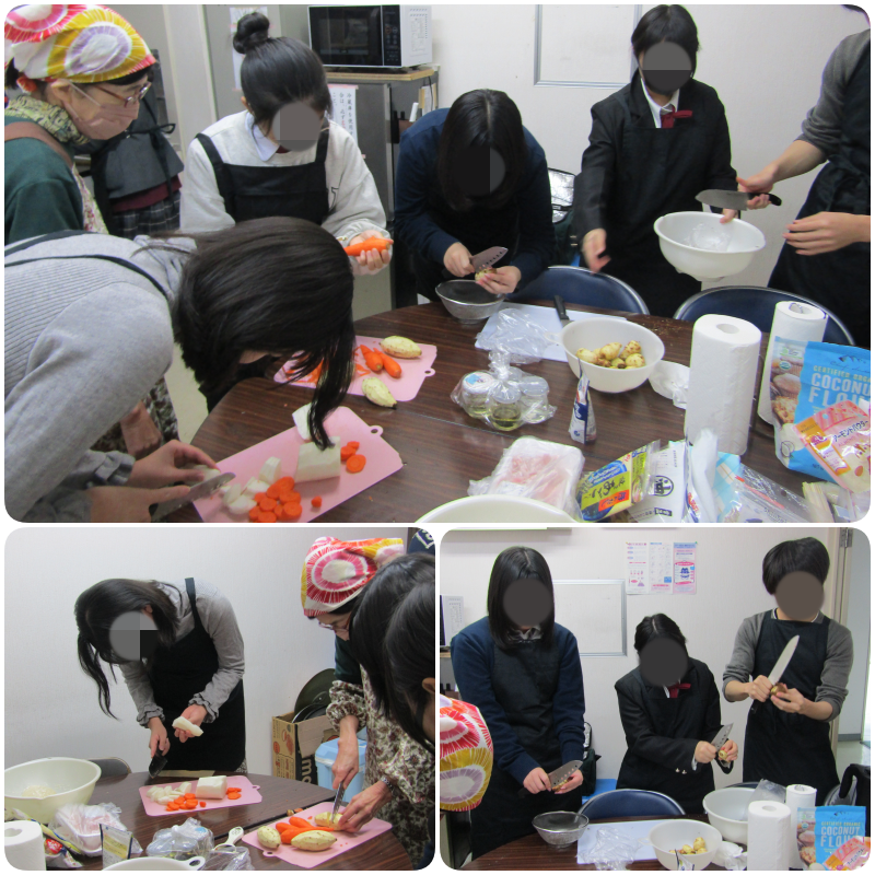 まずは野菜たちを切っていくのですが、ゴボウ、里芋は初めて皮むきをするといった人も多かったようです。包丁の上手い使い方を先生から学びながらうまく皮むきをすることが出来ていました。生徒の中には早く要領を掴んで周りの生徒にレクチャーをしている生徒もいました。感服です。