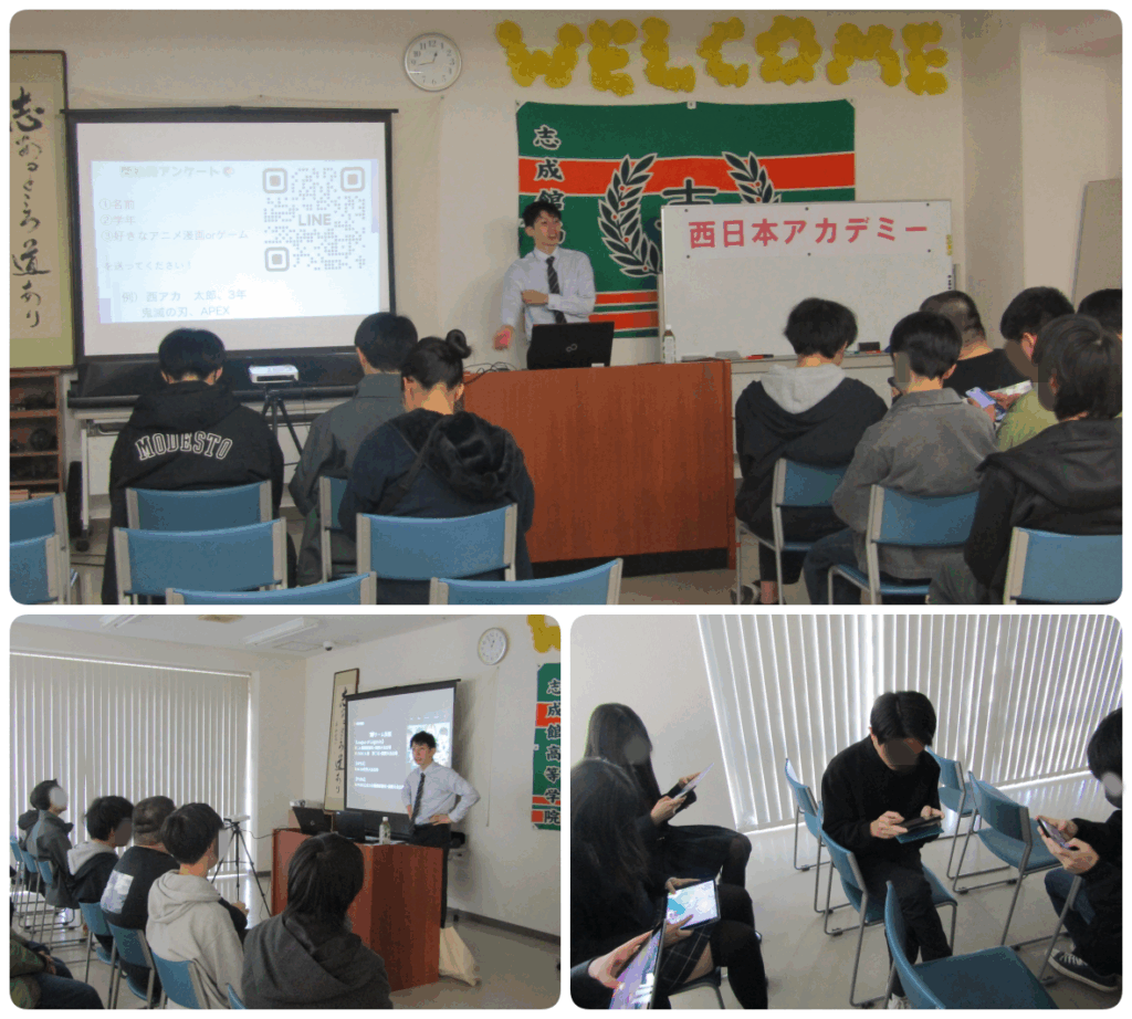 本日の総合探求の時間にて、西日本アカデミー専門学校様をお招きし、学校説明を行っていただきました!eスポーツに関する学部があるとても珍しい学校です。みっちり実技の練習ができるだけでなくプロ選手からの指導も受けることができ、選手をサポートするためのマネジメントについても学ぶことができます。