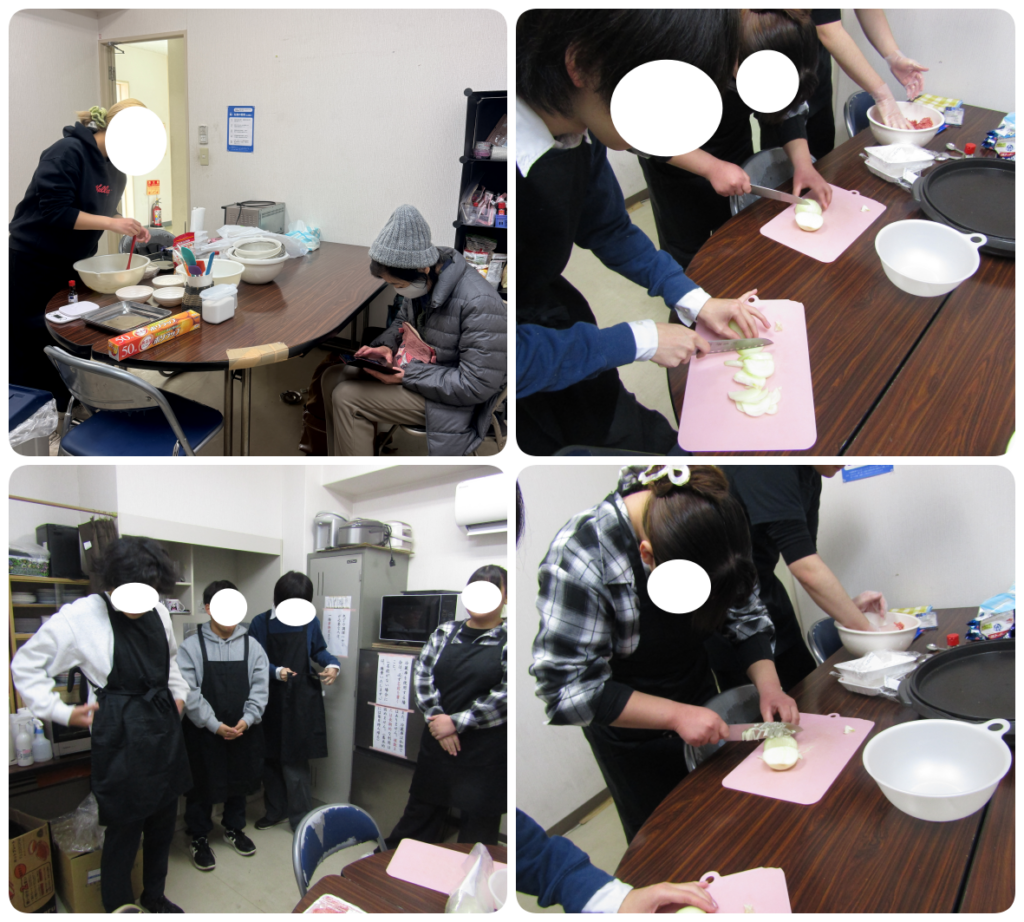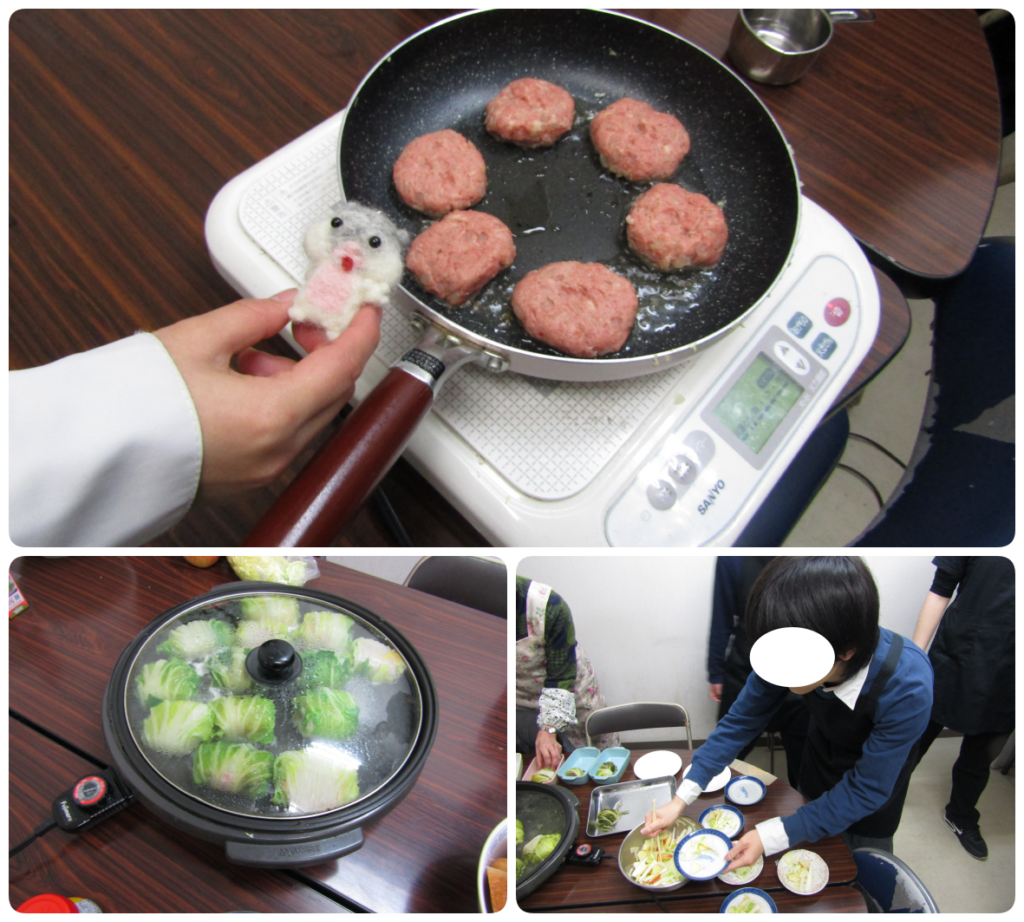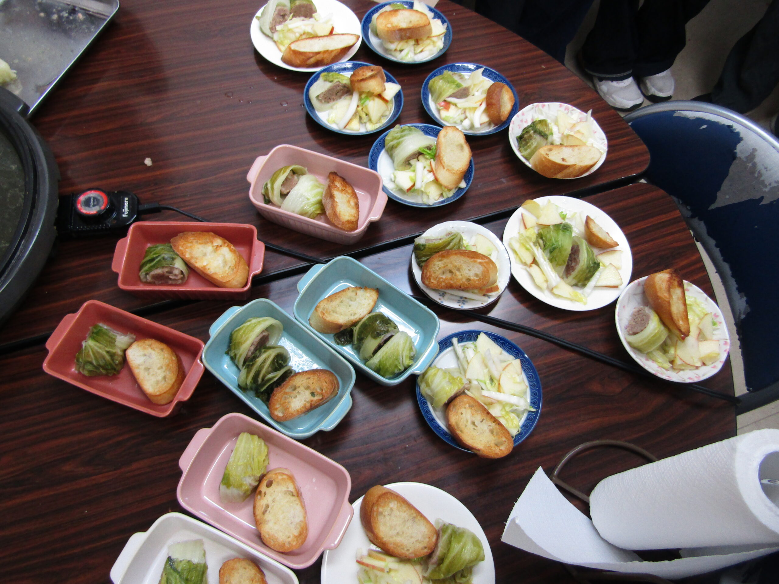まずは、午前中は2年生が調理実習でした。今回の献立はロール白菜。キャベツではなくて、白菜なんです!2年生男子には以前から私(甲斐)が包丁の扱い方をみっちり仕込んだの甲斐があり、中の肉に混ぜ込む玉ねぎのみじん切りでは大活躍してくれました。食材を抑える左手の危なっかしさが取れてきて、ちょっと頼もしくなった姿がちょっぴりと嬉しかったです。でも、切る以外はまだ苦手な男子諸君に代わって、女子生徒たちは残りの工程で魅せてくれました。ロール白菜のタネの部分の肉を焼く過程でいろんな生徒や先生たちが吸い寄せられました。出来上がったロール白菜にはガーリックブレッドを添えて振舞われました。旨っ!