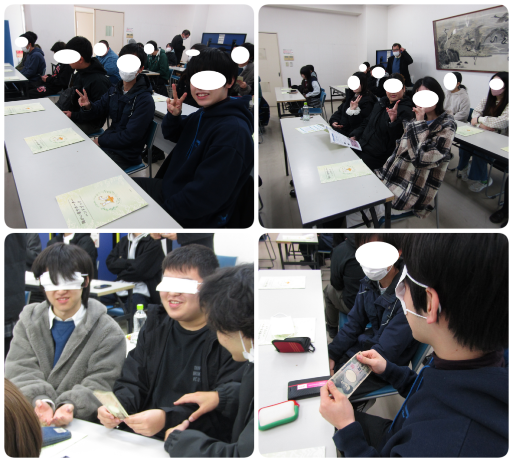 ところで、目の不自由な方はどうやって紙幣を認識するのかというと紙幣によって、特定の場所に線やマークがついており、その凹凸によって、どの紙幣なのか、どのタイプの紙幣(新または旧)なのかを判別できるようになっているそうです。それから、携帯端末のアプリケーションでどの紙幣なのかを判別するものもあるということを教えてもらいました。世の中の人々が気持ちよく過ごせるように、バリアフリーについて知ること、どのように進化してきているかを私たちも知ることが大事ですね。