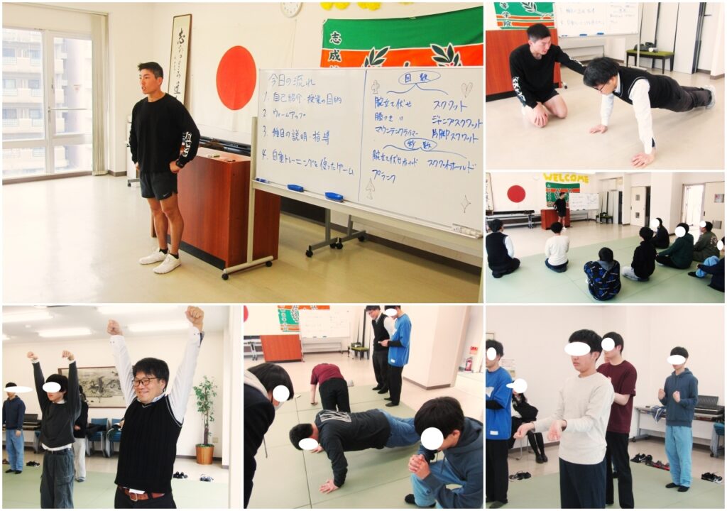 さて、本日の体育は、何と卒業生による特別授業「情〇、筋肉教室!」でした。筋力トレーニングでもカリステニクスまたはキャリステニクス(Calisthenics)という自重を使ったトレーニング法(腕立て伏せやスクワットなど)を楽しく学ぼうという内容です。まずは、トレーニングをする前の準備運動を入念に行いました。準備運動もしっかりと筋肉を伸ばしたり、縮めたりするだけでなかなか体が温まります。ストレッチやヨガでもある程度は筋力はつくというのも頷けます。沖住先生とか準備運動で汗かいてました。