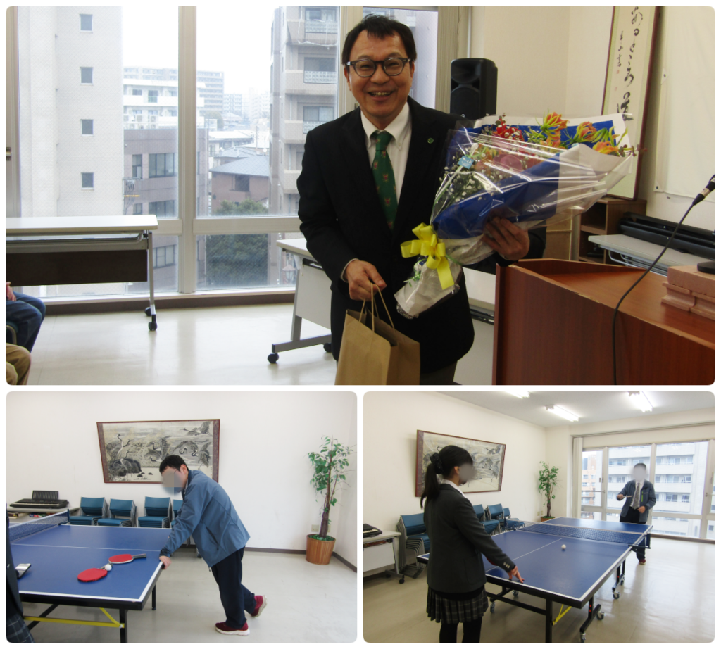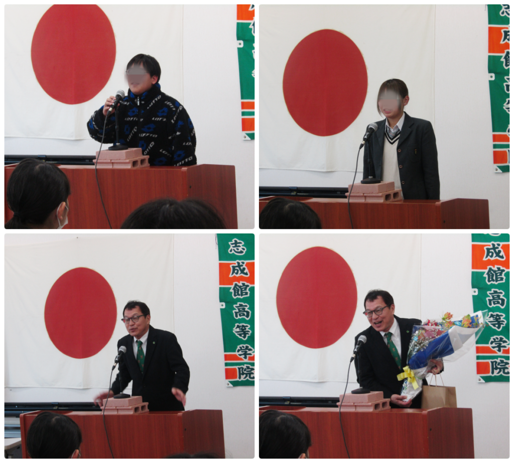 そして、今年度いっぱいで志成館をご退職される清田先生からのメッセージもいただきました。生徒からはサプライズでプレゼントと花束を贈呈しました。18年間、本当にお疲れ様でした。3月になっても日によっては清田先生と会うことはできるとのことです。清田先生に会いたい生徒はお早めに!