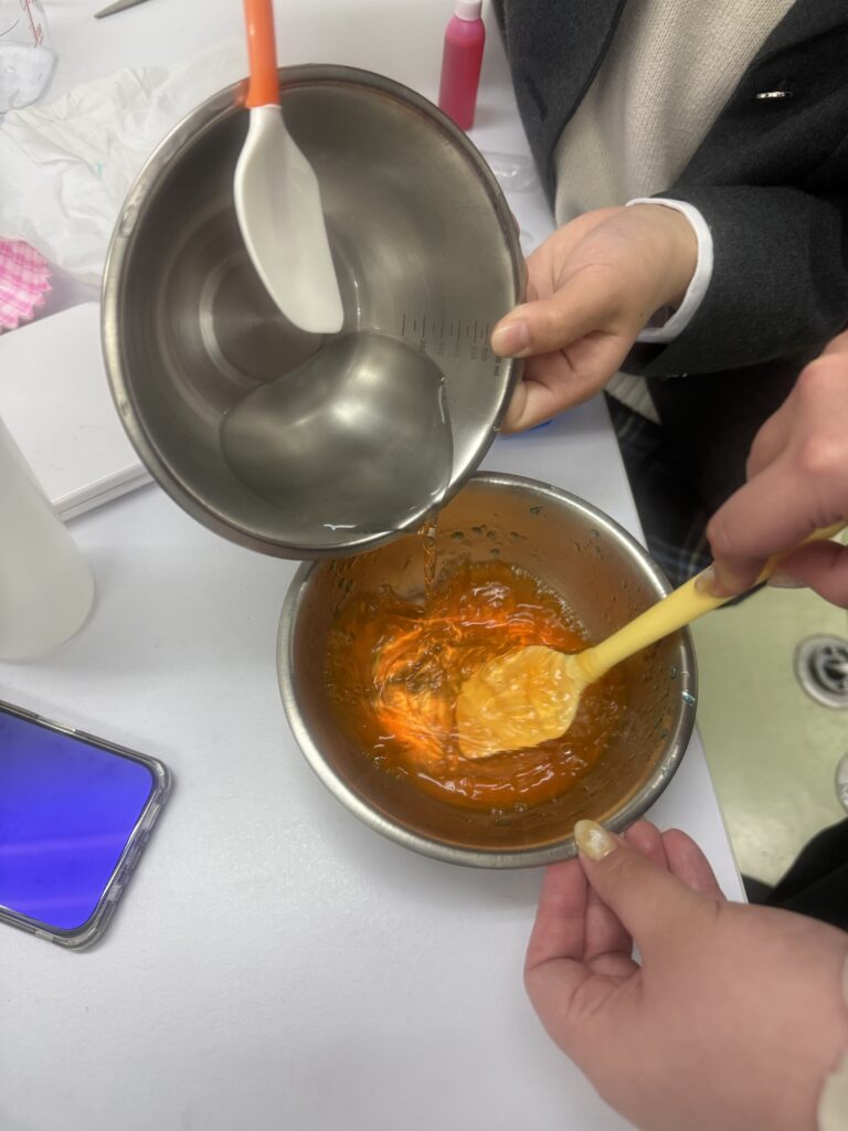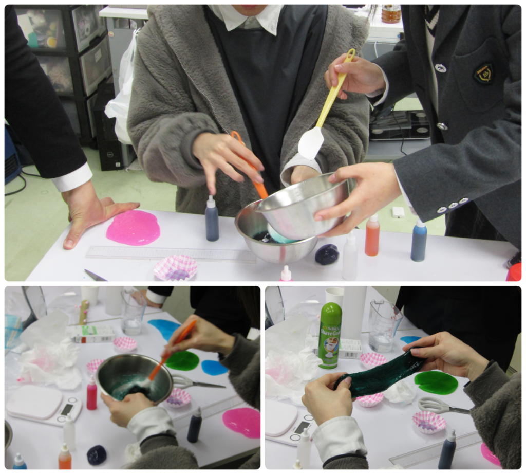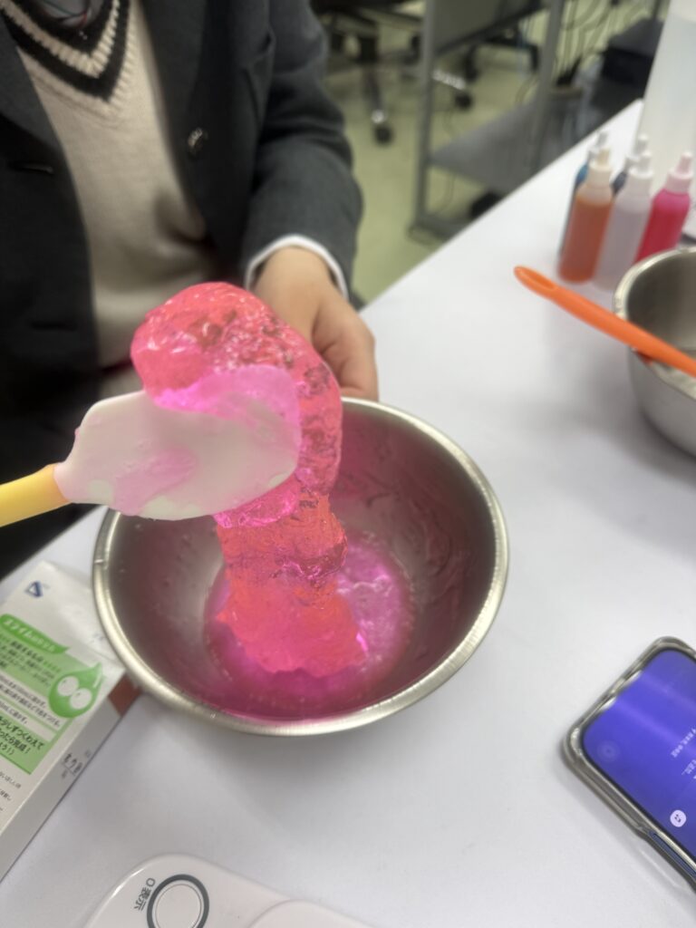 思わずぷにぷにと触ってしまいました。すると新たに材料を買ってきて作り始める生徒と先生の姿も。私もスライムをつぶしたり指を突っ込んだりする動画を延々と見ていた時期がありました。あれって見始めると止まらなくなりますよね。