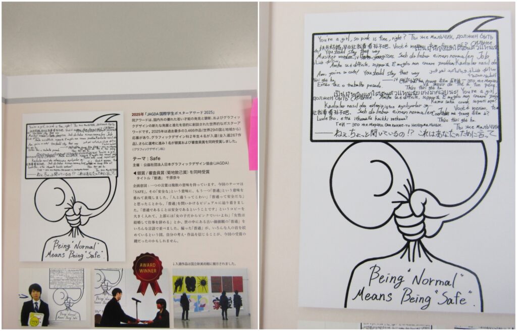 そして今回、こちらの作品なのですが、JAGDA(公益財団社団法人日本グラフィックデザイン協会)国際学生ポスターアワード2025で銀賞と審査員賞の同時受賞をしているんです。もう私(甲斐)は鼻が高いです!こちらのポスターアワードには3,466作品(世界29の国と地域から応募)あり、その中で熊本デザイン専門学校の生徒さんたちが4名も入選(全入選267作品)し、国立美術館に展示されたそうです。銀賞と審査員賞はさらに選考が進み、選ばれたわけです。いや、本当にあっぱれです!ここまで生徒を育ててくださった熊本デザイン専門学校さまには本当に感謝です。