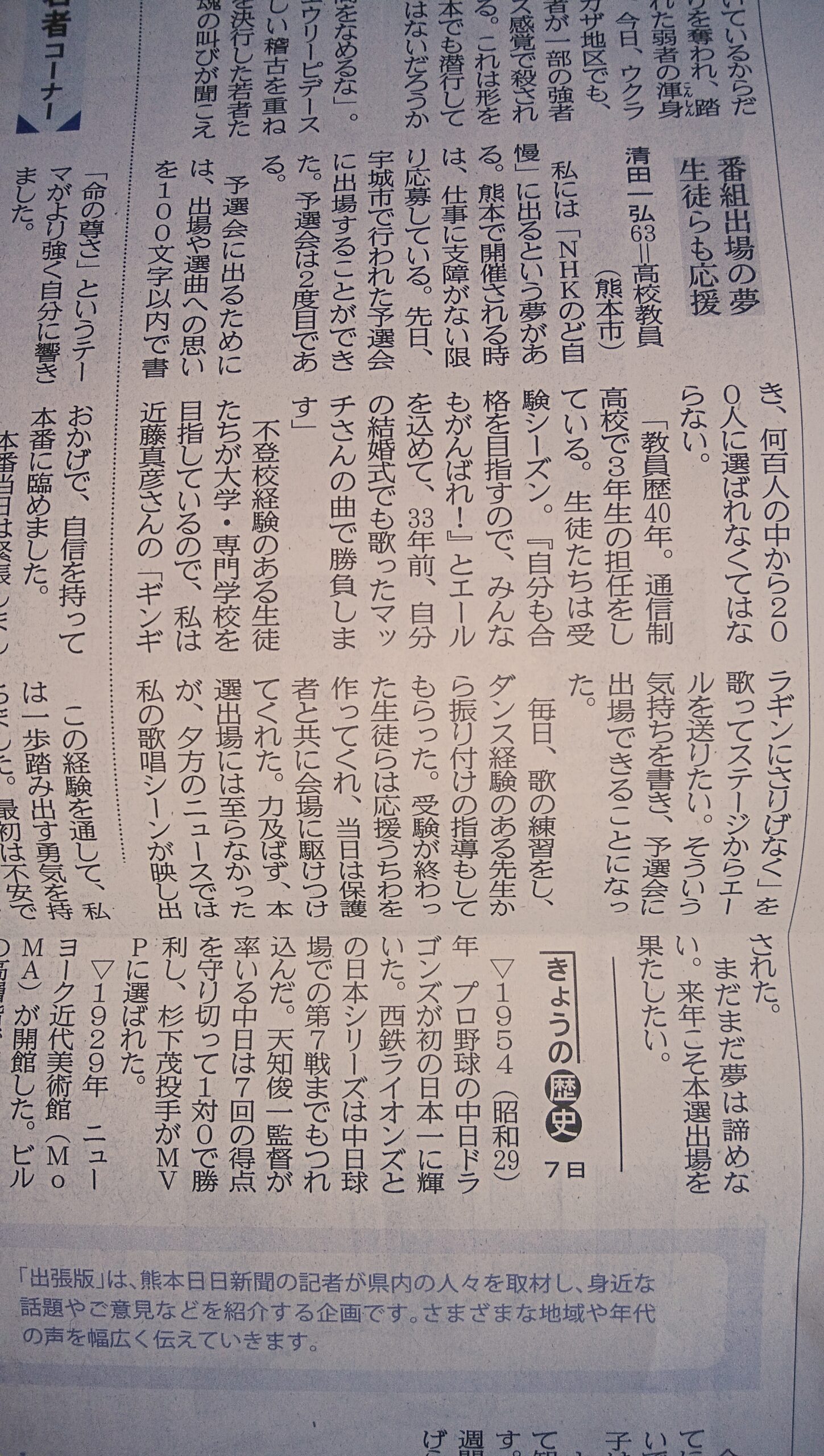 清田です。 11月7日(金)の熊日新聞『読者ひろば』に、私の投稿文が掲載されました。 先月、宇城市で開かれたNHKのど自慢の予選会に出場した時のことを書いたものです。投稿したのは、予選会が終わってすぐでしたので、志成祭の […]