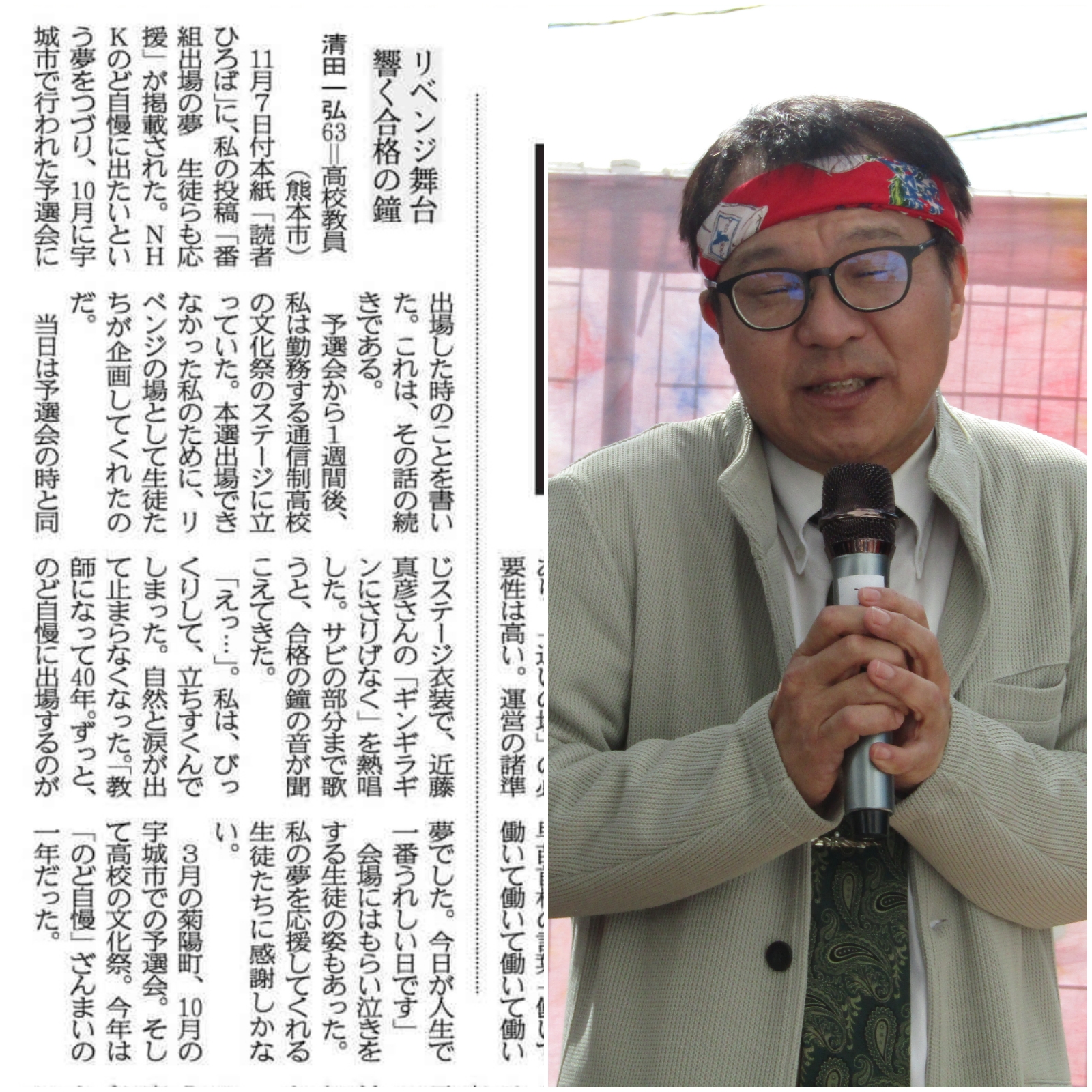 もっと読む »清田です。 12月27日(土)の熊日新聞『読者ひろば』に、私の投稿文が掲載されました。 「一年を振り返る」特集で、志成祭のステージで、10月に宇城市で行われた「のど自慢」予選会のリベンジをさせていただいたエピソードをつづ […]