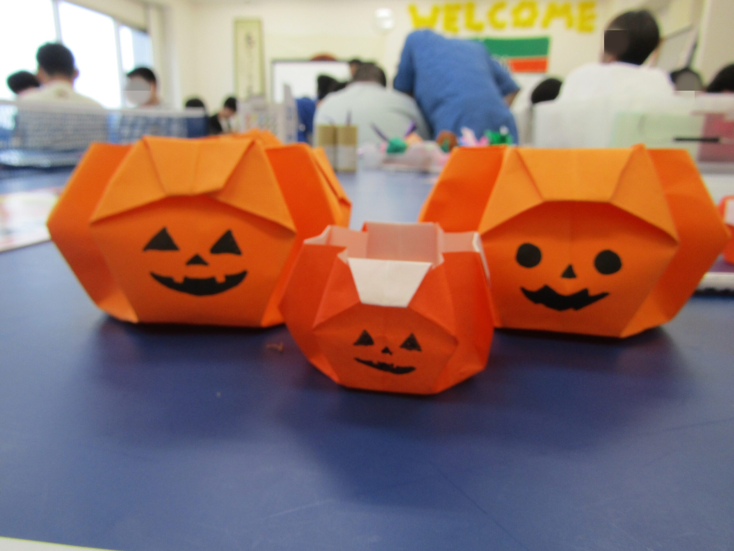折り紙で立体のかぼちゃを折ったり、風船を折ったりと「どんなもの作る?」と同級生と話し合いながら素敵な作品を作っている姿が印象的でした。