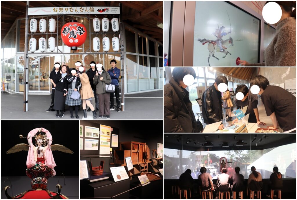 1Fには妙見祭で使う衣装の展示、妙見祭を始めとした八代の祭や文化を学べる大きなタッチパネル式のディスプレイがありました。このディスプレイでちょっとしたゲームも楽しめます。小さな子どもにも楽しんでもらえるようにしてあるのか難易度は低めですが、妙見祭について描かれた絵巻のなかの人物や道具を動かせるのが何とも不思議でした。1Fには体験シアタールームもあり、そこには180度展開の大きなスクリーンとお祭りで使用する笠鉾(実物)が置いてありました。スクリーンには妙見祭の様子が投影されます。妙見祭で馬を引く様子を間近で見ると迫力がありました。それから、生徒の知り合いが動画に映っていたらしく、途中で笑いがおきました。やはり、地元の祭の映像ならではですね。このシアターは2Fからも見学ができます。(というか私たちは2Fから見たんですがね。)上と下では見え方が違うはずなので比べて見るのも面白いですね。季節や月によってシアターの内容も変わるようなので何度も通えるのがお祭りでんでん館の良いところです。ということで、是非、また別の季節にでも見学に行ってみましょう!