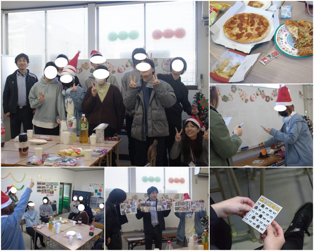 本日はいつものように体育でしっかりと運動をした後、お待ちかねのクリスマス会が行われました。クリスマス会ではピザやお菓子、ジュースなどが振舞われました。体育で疲れた後の一杯とホカホカのピザは生徒たちの身に染みたことでしょう!ちなみに私(甲斐)はチーズが苦手なので涙目でした…。