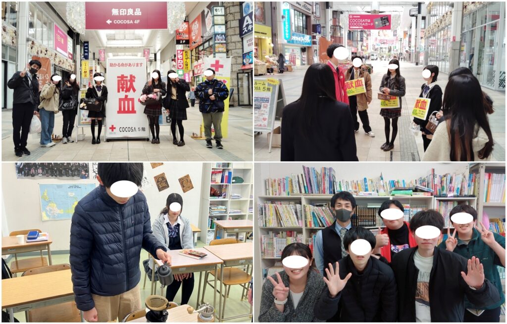 本日は再びCOCOSA前の献血呼びかけボランティアに行ってきました。今回も生徒たちは道行く方々に献血に興味を持っていただくべく呼びかけ活動を頑張ってくれました。献血についての情報を掲載するページにアクセスするためのQRコードが印字された紙に飴を貼り付けたものを配布してまわるのですが生徒たちがとても頑張って声をかけ、かなりの数を配布したため、献血スタッフの方からお褒めの言葉をいただきました。途中で足りなくなったので補充するくらい頑張ったんですよ!